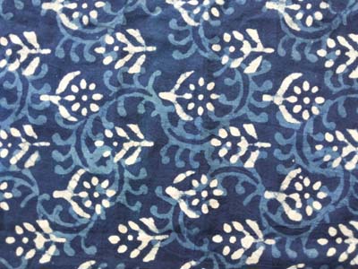 After this fabric has been pre-shrunk and dried it is placed on the printers table. There, a dabu mud paste is hand printed on the fabric. After the the paste has dried the fabric is dipped in an indigo vet dabul dabu indigo