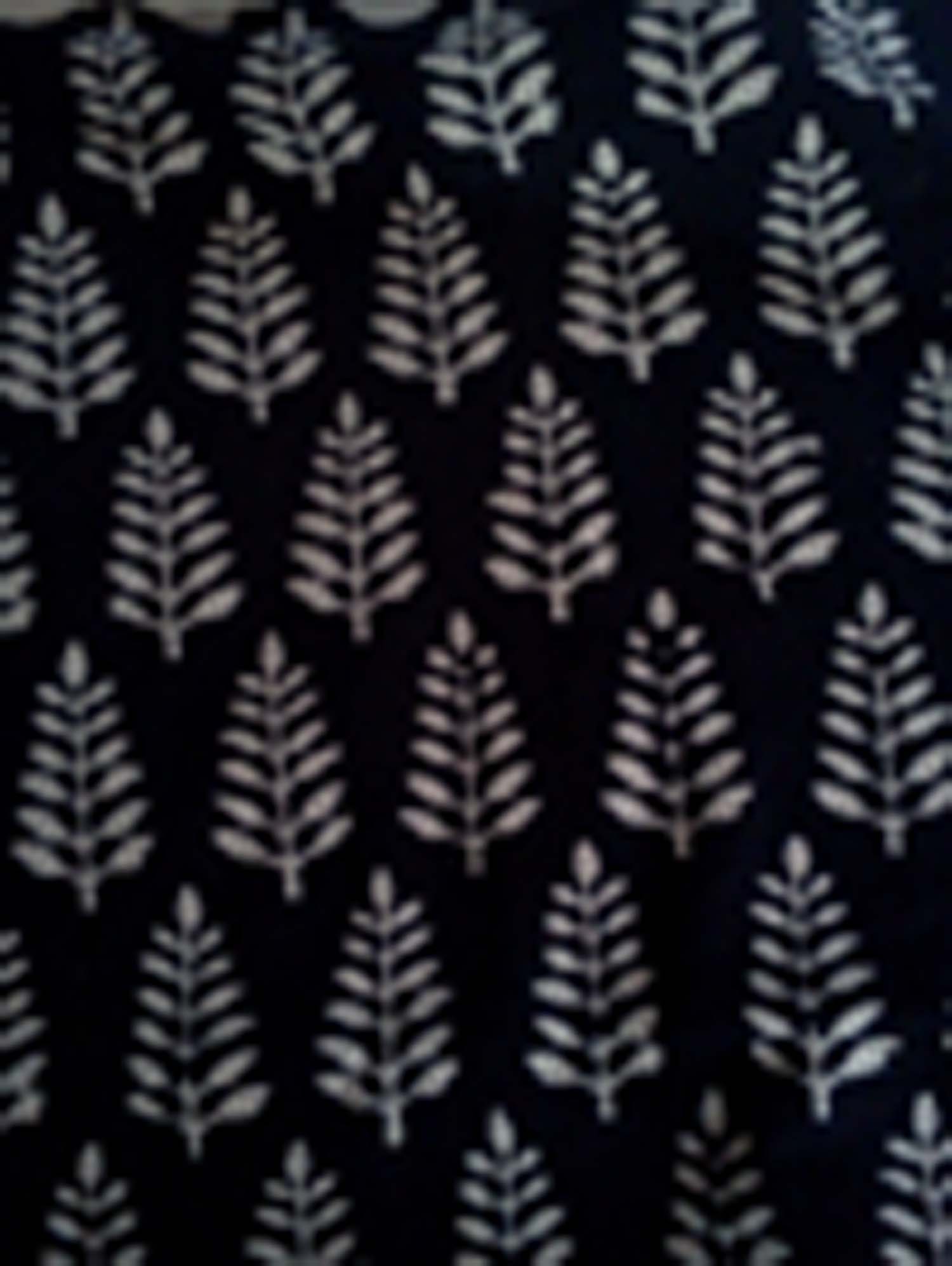 Printed on cotton fabric this is a traditional motif of Bagru. The black color is printed using the locally made jegri (shahi) color. The off-whote background is a Harda, which is used in Bagru as a natural mordant for the colors.