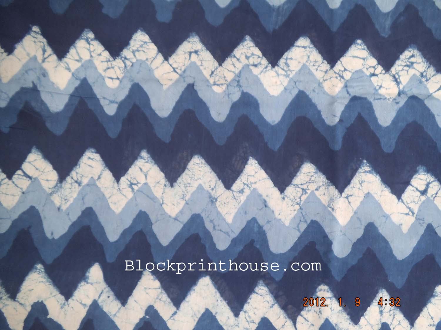 After this fabric has been pre-shrunk and dried it is placed on the printers table. There, a dabu mud paste is hand printed on the fabric. After the the paste has dried the fabric is dipped in an indigo vat! To complete the process the dabu paste is removed leaving behind the original color of the fabric.