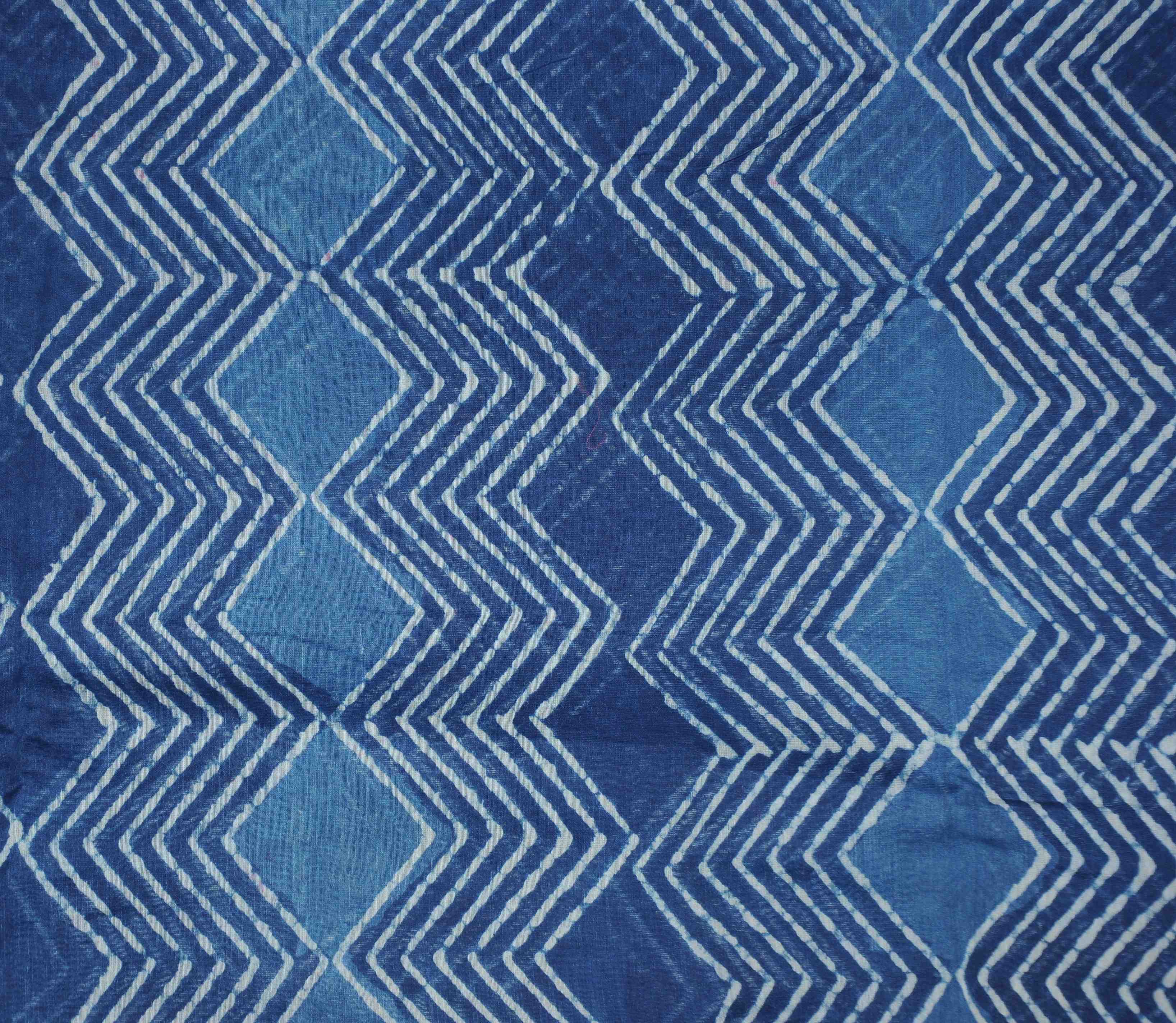 After this fabric has been pre-shrunk and dried it is placed on the printers table. There, a dabu mud paste is hand printed on the fabric. After the the paste has dried the fabric is dipped in an indigo vat! This process is repeated twice to reveal the two tones of indigo. To complete the process the dabu paste is removed leaving behind the original color of the fabric.